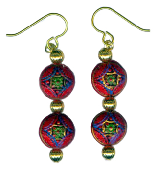 Festive earrings showcasing red oval beads with Russian design offset with goldtone accent beads suspended from yellow niobium earwires