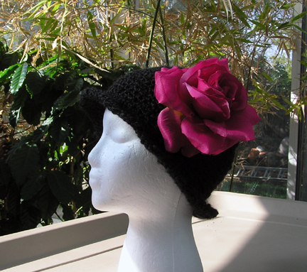 A cloche style hat made with a soft textured yarn in black. 98% acrylic 2% polyester. A very soft hat with fuchsia fabric flower accent attached with velcro.